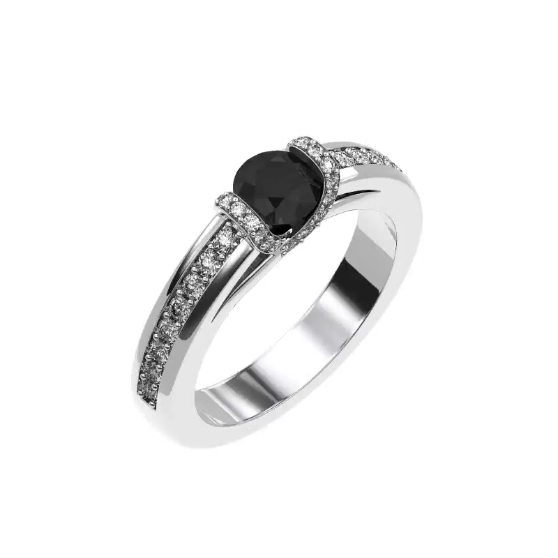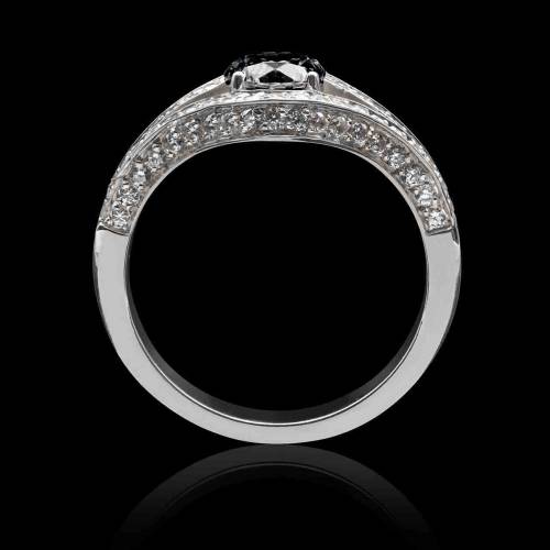 Bague en or 18 K (5,6 g), pierre centrale diamant noir (1 carat; 1,5 carats; 2 carats), pavage : diamant (0,44 carat), diamant noir (0,44 carat), rubis (0,5 carat), saphir bleu (0,5 carat) et saphir rose (0,5 carat)