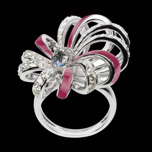 Bague en or 18 K (14,1 g) , pierre centrale saphir rose (1 carat; 1,5 carats et 2 carats), pavage pierres précieuses (diamant 1,09 carats ou rubis 1,23 carats ou émeraude 0,86 carat ou saphir bleu 1,23 carats ou saphir rose 1,23 carats). Possibilité de 23 couleurs de laque